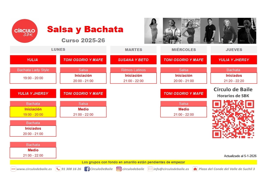 ¡Estos son nuestros horarios de Salsa y Bachata para el curso 2025-2026!❤️ Reserva tu plaza llamando al 913081626 o escribe a info@circulodebaile.es … Ver masVer menos